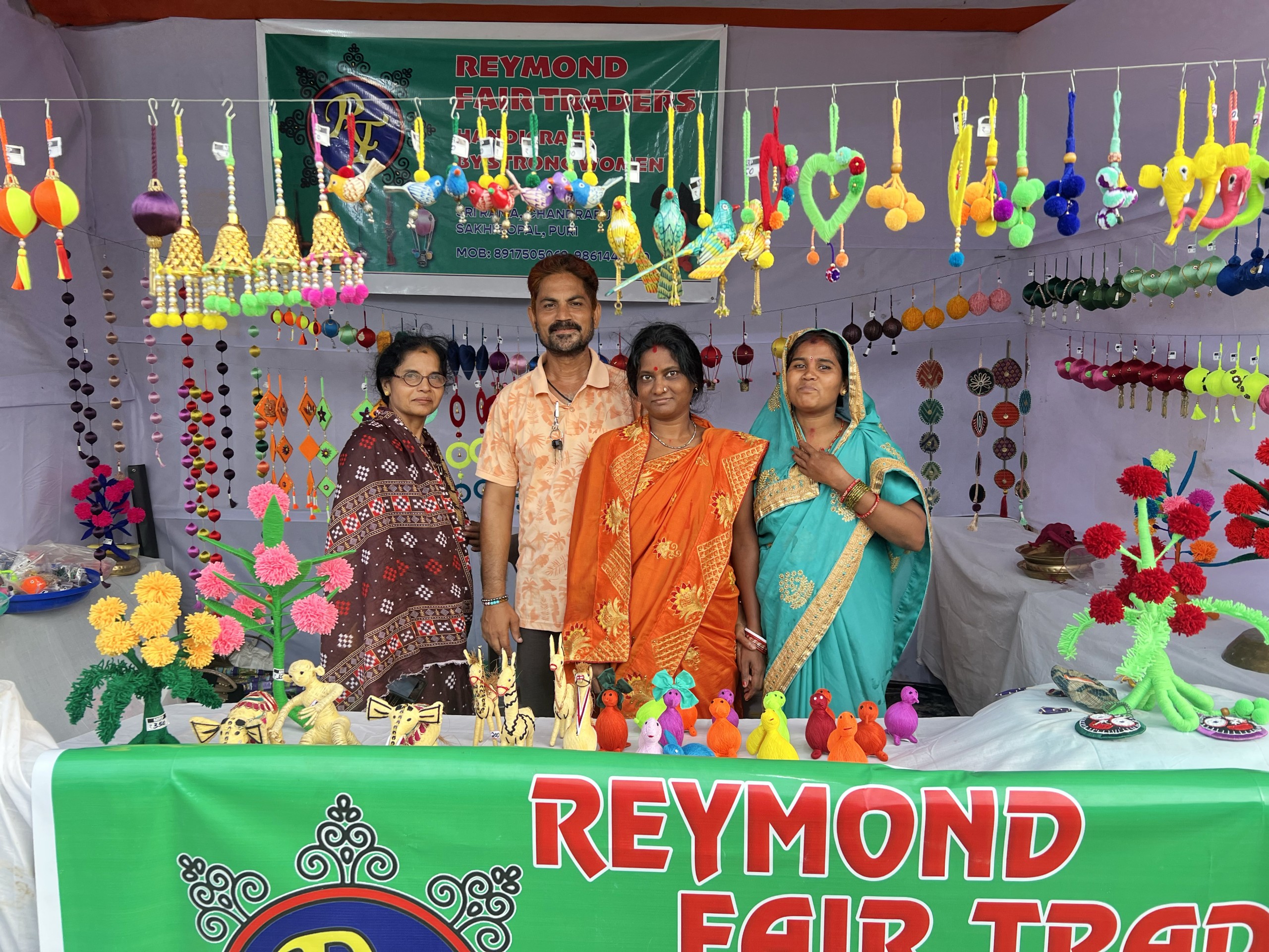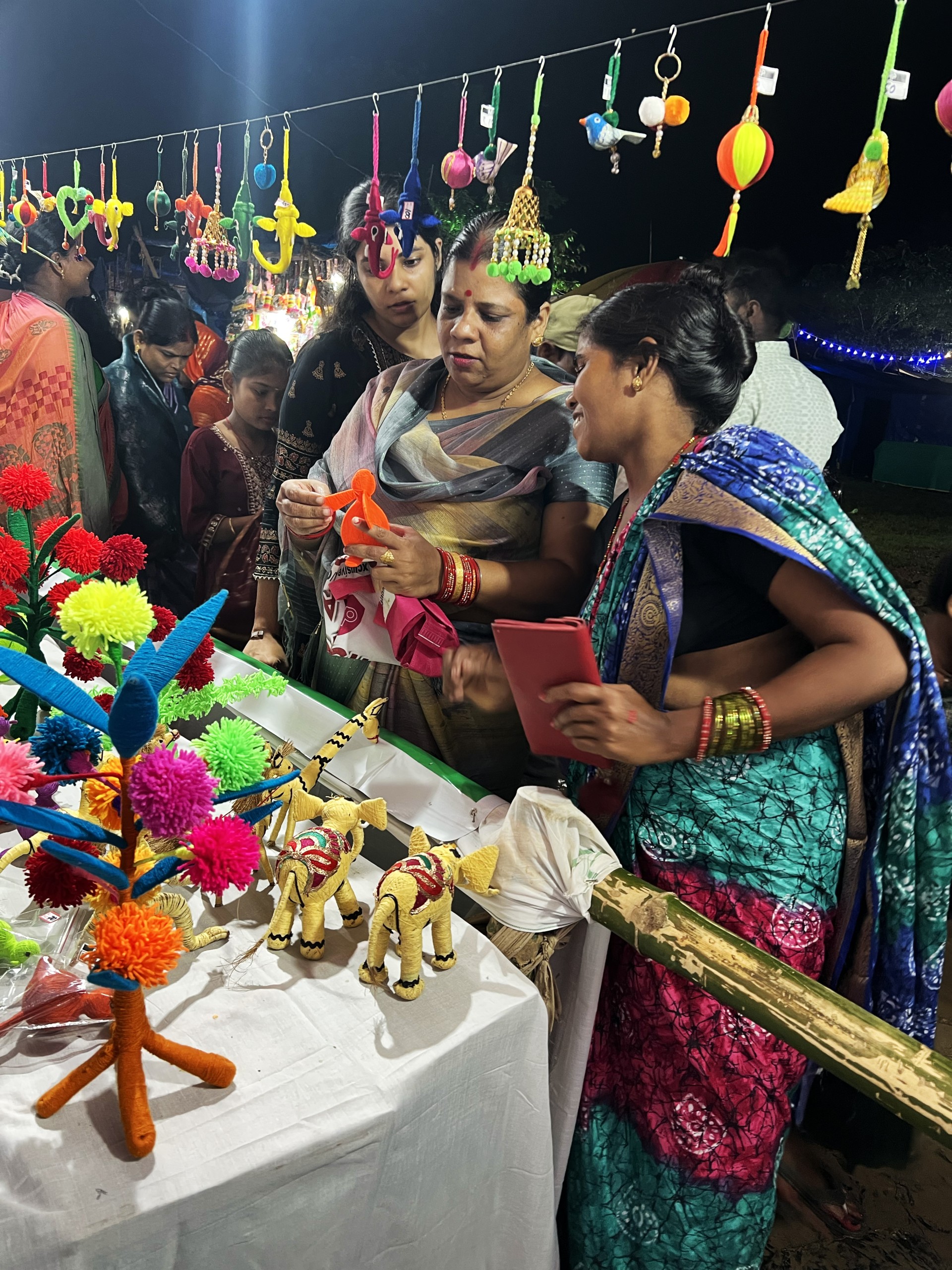 Der Regen sorgte dafür, dass alle am Aufbau Beteiligten knöcheltief im Matsch standen. Doch Pintu und seine Unterstützer liessen sich davon nicht beirren: Da die Gruppe keinen der "Government-Stalls" bekommen hatte, bauten sie kurzerhand ein eigenes Bambus-Gerüst und deckten es mit Planen ab. Glücklicherweise ist Sakhigopal nur etwa 10 Minuten Fahrt von Shri Ramachandrapur entfernt, so mussten alle benötigten Materialien weit transportiert werden und alles Fehlende konnte noch organisiert werden. Viele der anderen Marktstand-Betreibenden öffneten ihren Stand am ersten Tag gar nicht erst, da die Bodenbedingungen so schlecht waren. Doch Pintu, Lakhi und Sunita hielten trotz wenigen Besuchenden durch und Rina kam ebenfalls zu Besuch.