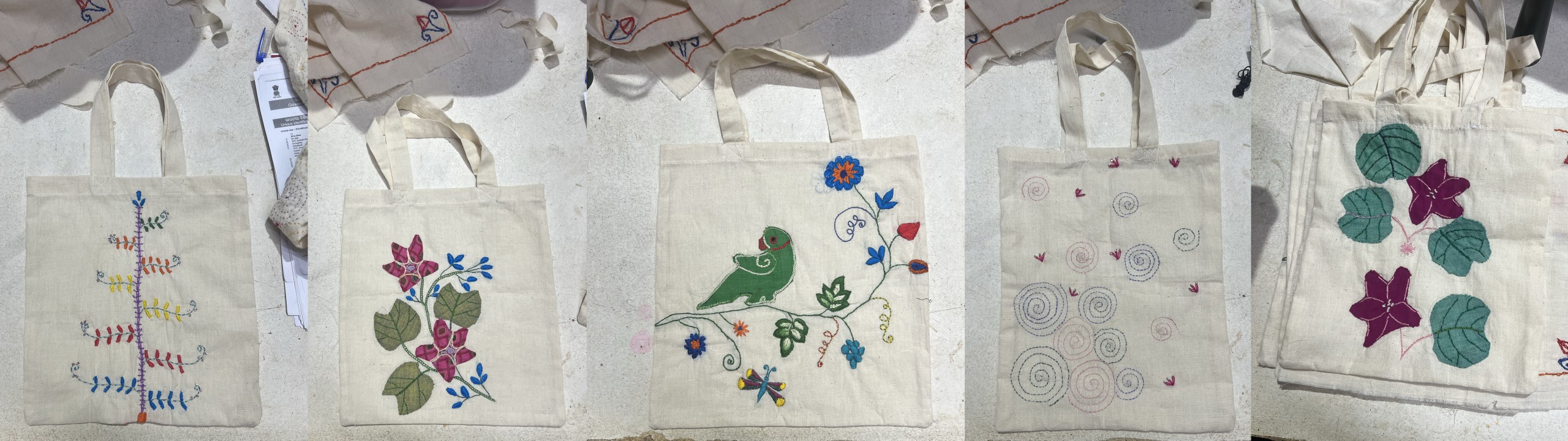 Im zweiten Monat war die Aufgabe, erst ein Stück Stoff zu besticken. Dabei konnten die teilnehmenden Frauen entweder selbst ein Motiv zeichen oder einen Entwurf von Pankaja übernehmen. Dabei hat sie die verschiedenen Stärken der Frauen mit einbezogen. Am Ende wurde die Tasche an der Nähmaschine fertig gestellt, dabei konnte auch das Verstürzen und der French Seam vermittelt werden.